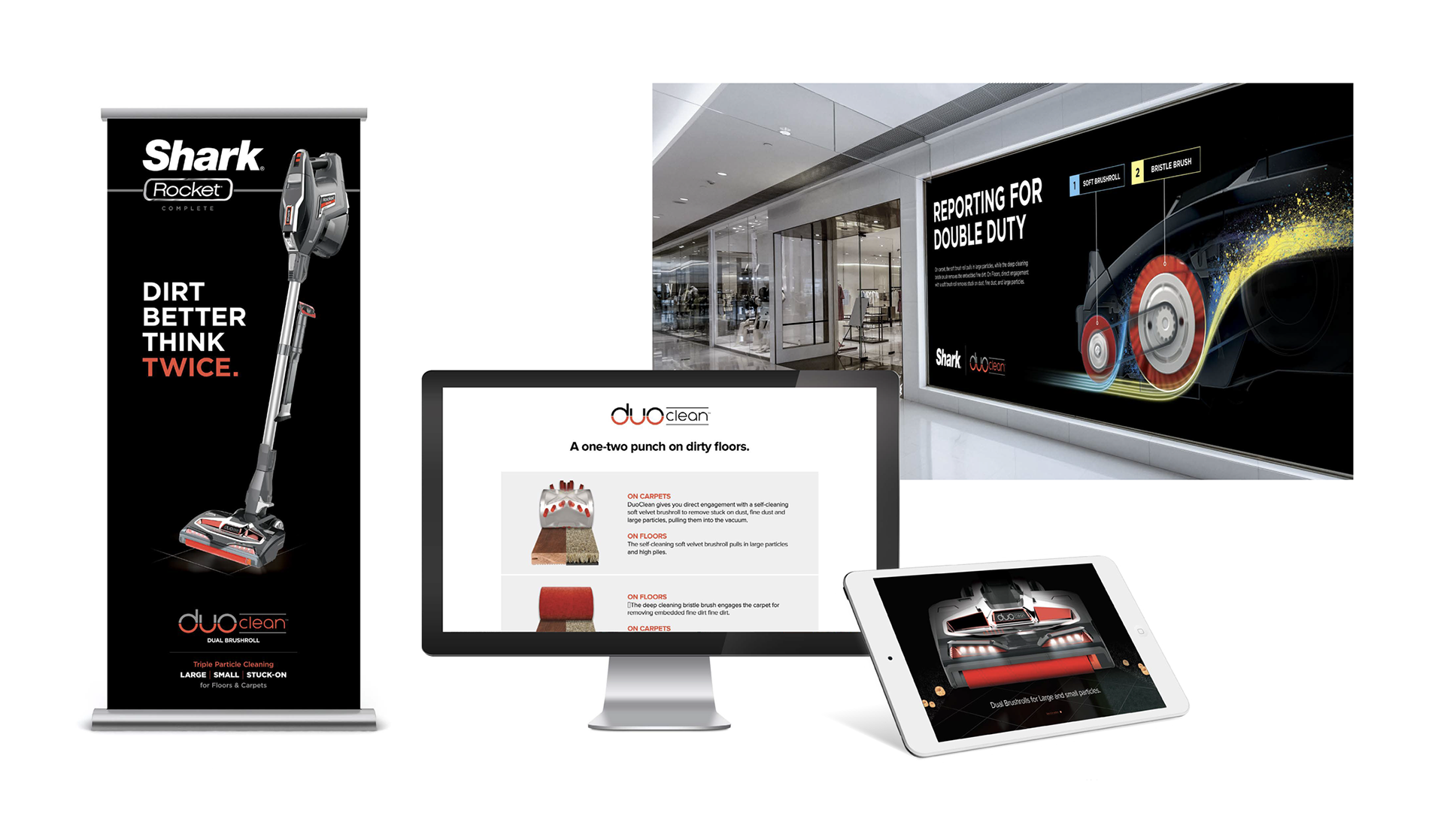 I designed the logo for Shark’s then-new DuoClean technology—a dual brush-roll system that offered breakthrough “Triple Particle Cleaning” across carpets and hard floors. The technology debuted in 2016 with the launch of the Shark Rocket Complete corded stick vacuum. Today, DuoClean remains a flagship feature across dozens of Shark vacuum products with this logo still serving as its visual hallmark in print, in digital, and on product.
