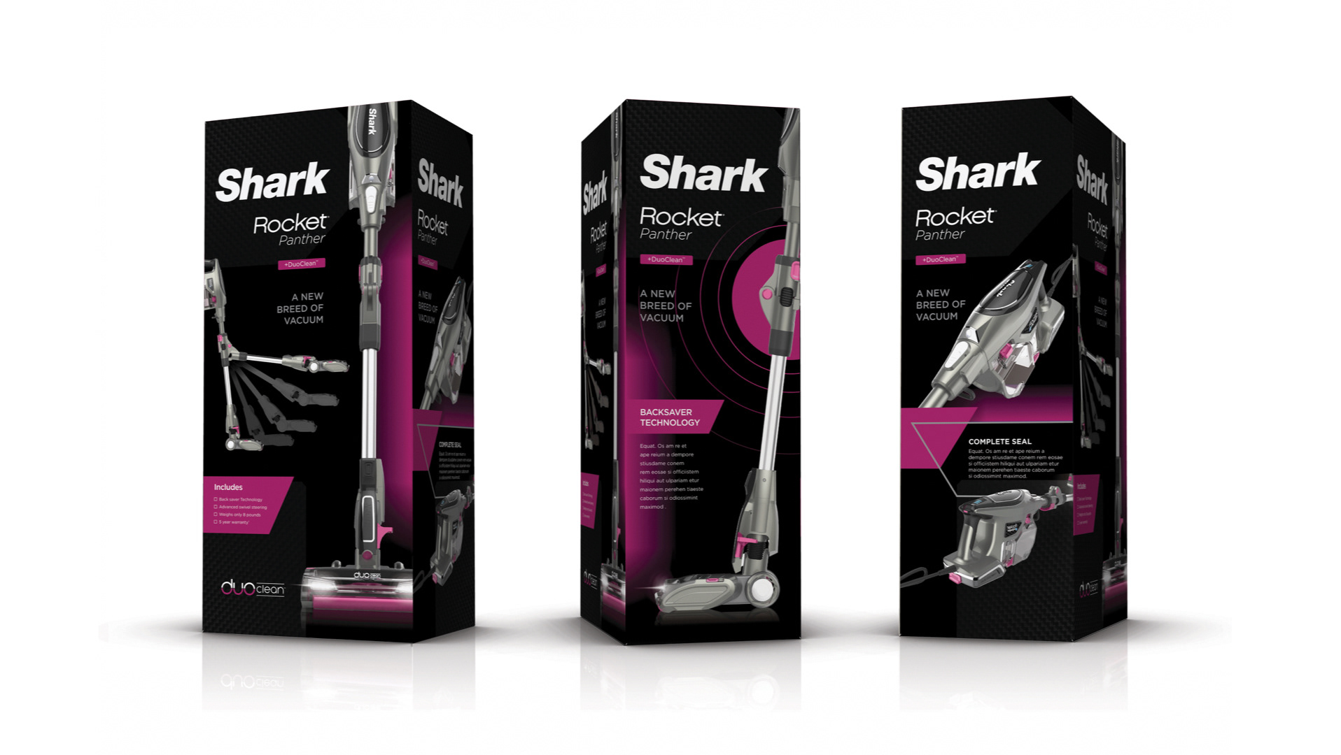 In 2017, I developed mood boards and packaging concepts to define the positioning for three new SKUs—a corded upright, a corded stick, and a cordless stick. These designs marked my first move away from Shark’s traditional maximalist style, establishing distinct visual identities for each product.