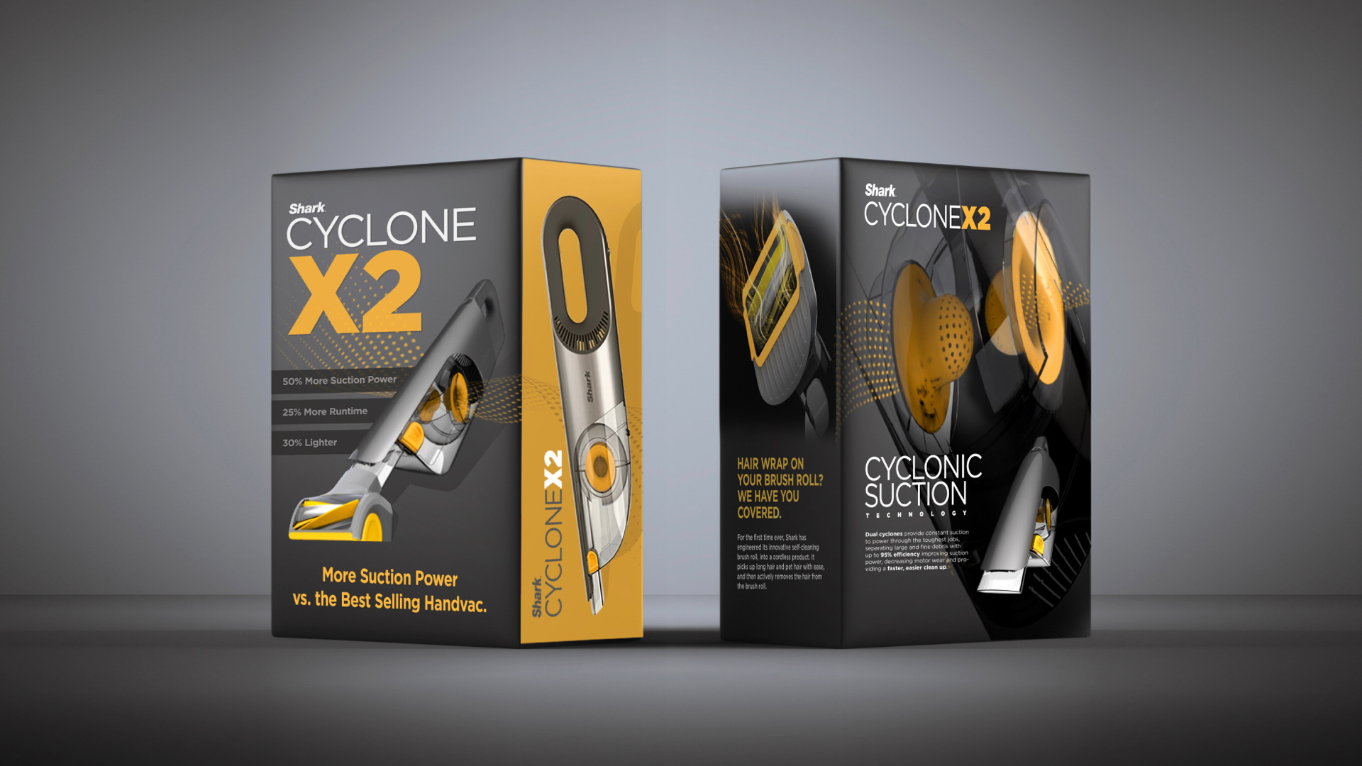 Since this was Shark’s first cordless hand vacuum with two cyclones—designed to outperform the best-selling hand vac at the time—I aimed for a more technical, performance-focused look.